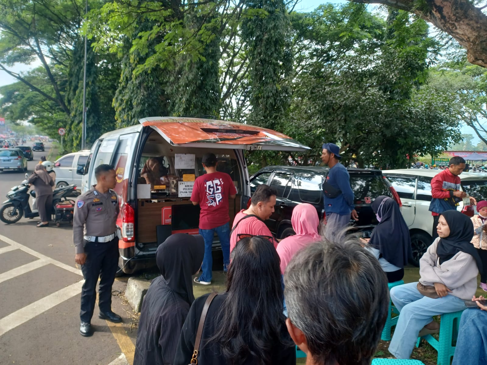 Petugas gabungan dari UPPD Samsat, Satlantas, dan Jasa Raharja tampak melayani masyarakat dengan ramah. Selain menerima pembayaran pajak tahunan kendaraan, mereka juga memberikan sosialisasi tentang aplikasi SIGNAL (Samsat Digital Nasional) sebagai sarana praktis untuk membayar pajak secara online.